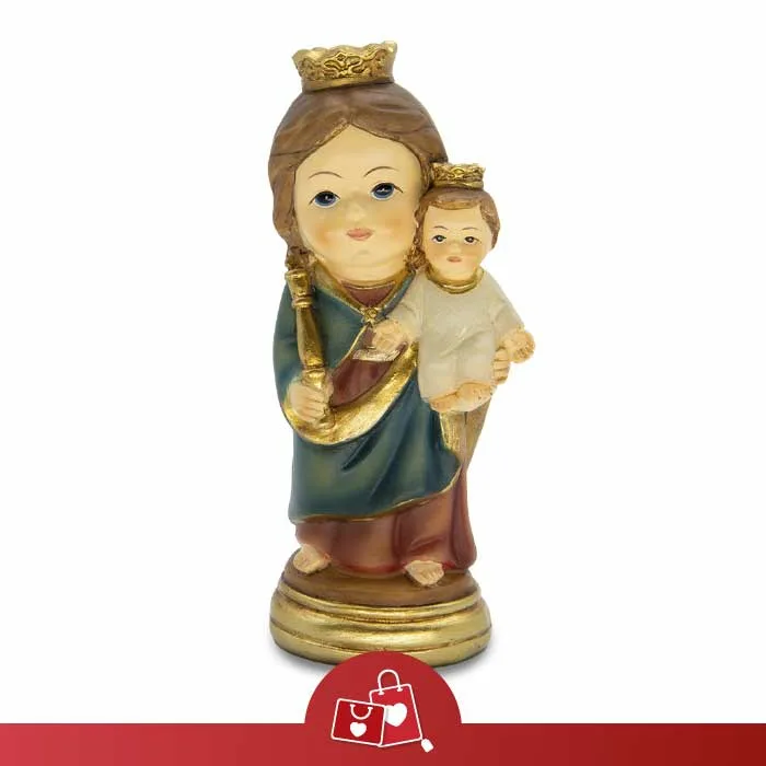 Con esta figura de María Auxiliadora de 10 cm en resina, lleva a tu hogar un símbolo de paz y protección diaria. Al adquirirla, colaboras en una iniciativa solidaria que beneficia a menores en situación de vulnerabilidad. Es un detalle cargado de fe y compromiso por un mundo mejor. Material: resina. Nº de piezas: 1 ud. Alto: 9,7 cm. (Ref. 01009)